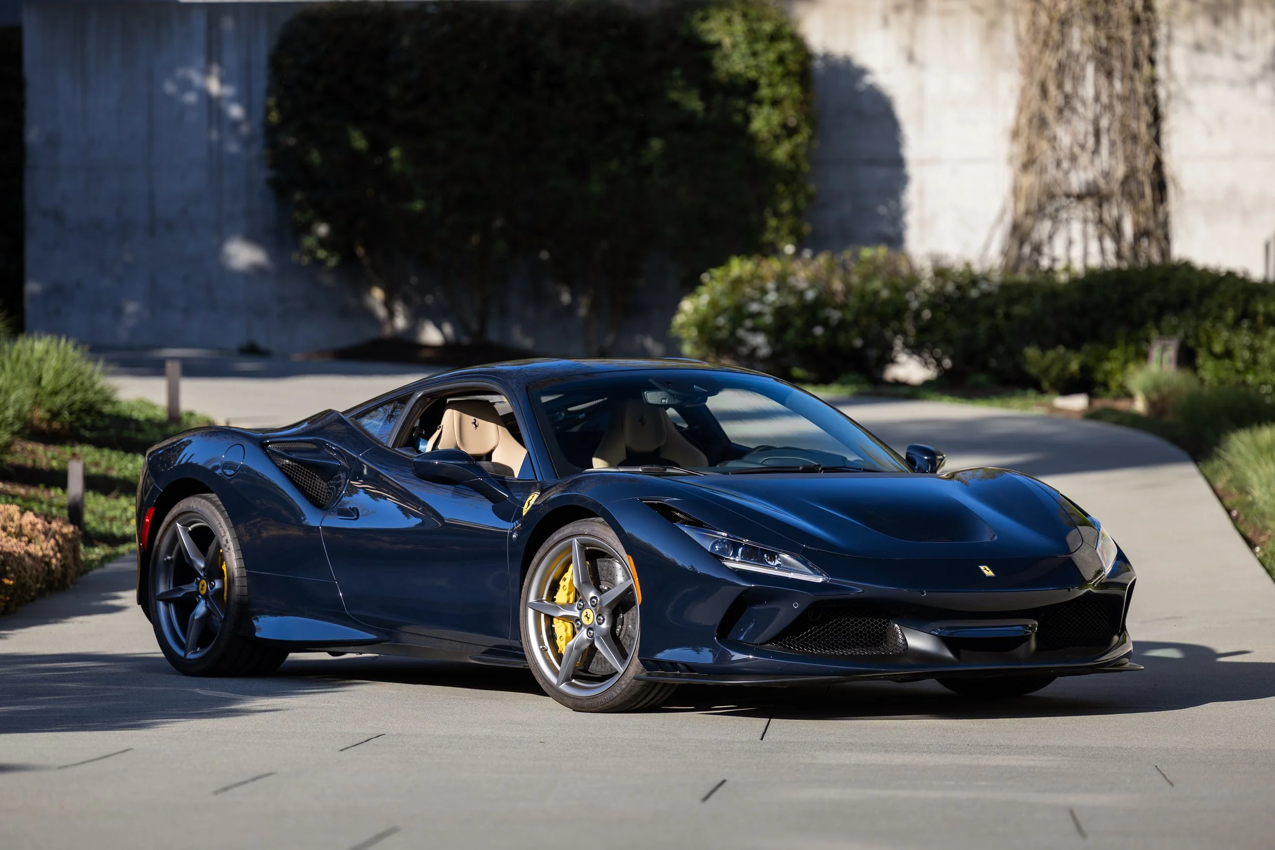 This 2020 Ferrari F8 Tributo is finished in Blu Pozzi over Sabbia leather with Blu Sterling and Blu Scuro Alcantara covering its carbon-fiber racing seats. Powered by a twin-turbocharged 3.9-liter V8 paired with a seven-speed dual-clutch automated transaxle, the car is further equipped with an electronically controlled limited-slip differential, 20″ five-spoke alloy wheels, carbon-ceramic brakes, SCM-E magnetorheological suspension, a front-axle lift system, AFS adaptive LED headlights, Scuderia Ferrari fender shields, parking sensors, front and rear cameras, a JBL sound system, titanium exhaust pipes, carbon-fiber interior trim, and navigation.