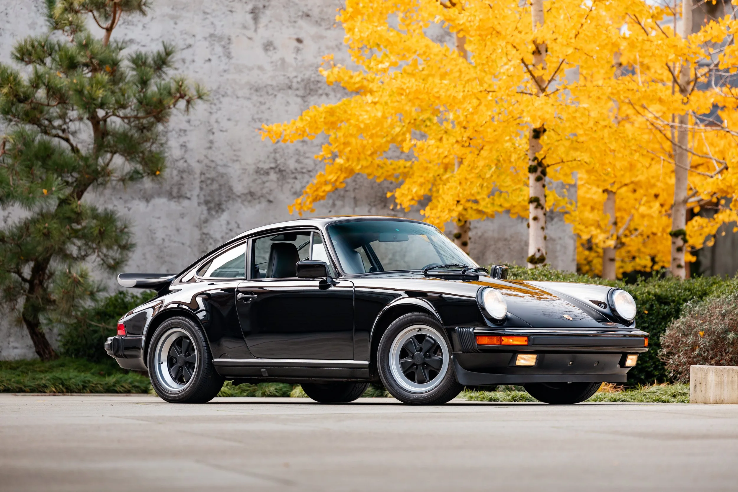 This 1989 Porsche 911 Carrera coupe was purchased new by the late spouse of its current owner from Bayside Porsche in Everett, Washington state, and the odometer currently shows 27k miles. Powered by a 3.2-liter flat-six paired with a G50 five-speed manual transaxle, the car is finished in Black over matching leather upholstery. Equipment includes 16″ Fuchs alloy wheels, a rear spoiler, a power-operated sunroof, and a rear-window wiper along with power-adjustable front sport seats, a factory CD stereo, cruise control, a Hi-Fi sound system, and air conditioning.